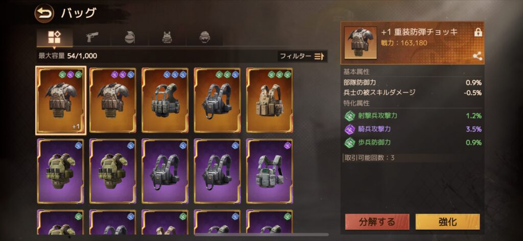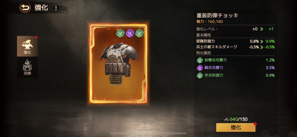 例えば、画像の騎兵攻撃力3.5%を強化したい場合、手持ちの部隊装備の中に、防弾チョッキ(同じ部位)のレジェンド装備(同じ等級)で、騎兵攻撃力の特化属性があり、3.5%より数値の高い装備のみが素材として使用できます。