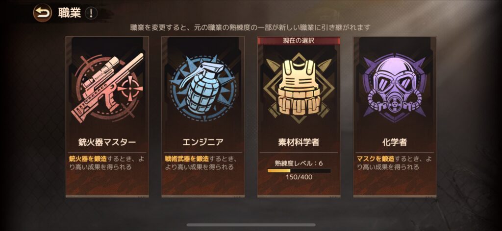 鍛造できる部隊装備の種類は4種類あり、それぞれ対応する職業を選択することで効率よく鍛造することができます。最終的には4種類全て鍛造することになるので、どの職業を選んでも良いです。が、一度選ぶと他の職業に切り替えるのに3,000ジェムまたは30日間待つことになるので、職業の選択は慎重にしましょう。