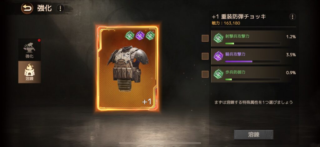 部隊装備の特化属性を強化することができます。溶錬に使用できるのは同じ部位・等級で、同じ種類の特化属性を持ち、元の装備より値の高い装備のみです。溶錬すると、素材として使用した装備は失われます。