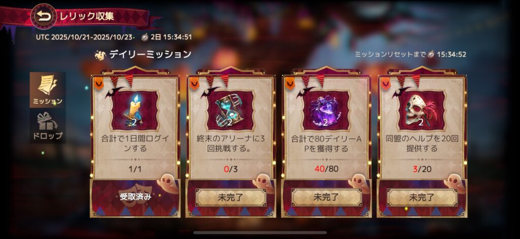 ログイン、終末のアリーナ、デイリーミッション、同盟のヘルプを行うことで、レリックを獲得することができます。