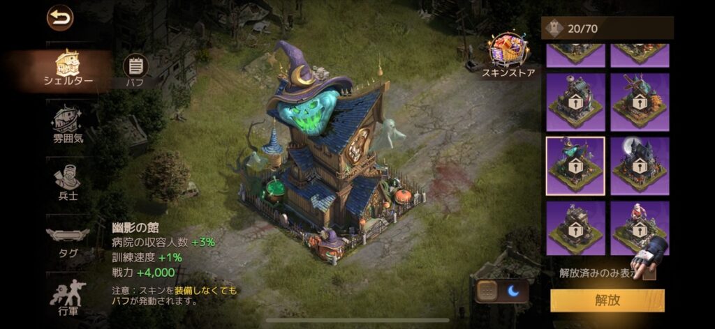 このシェルターは『病院の収容人数+3%』、『訓練速度+1%』のバフが付いています。これは、レイドイベントに参加する人であれば、買っておいて損はないシェルターです!(私は買いますw)