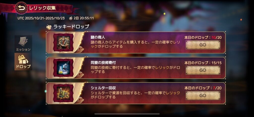 謎の商人、同盟の技術寄付、シェルター回収から一定の確率でレリックがドロップします。ドロップするとメール(システム)が届きます。