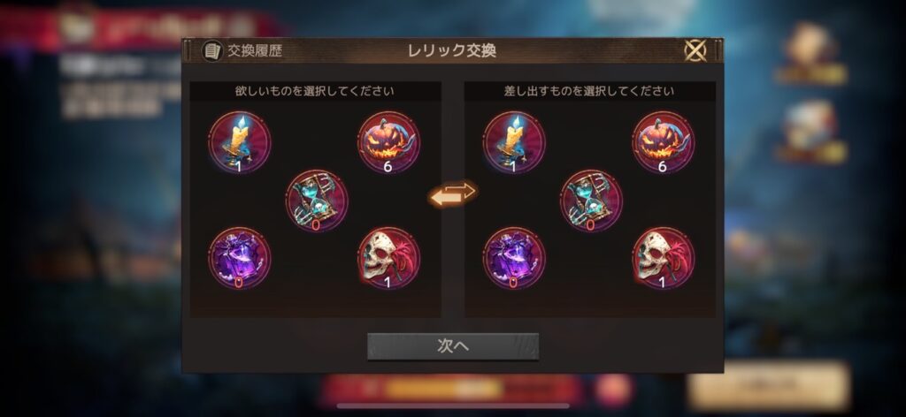 欲しいレリックを余っているレリックと交換することができます。交換画面でレリックを選ぶと交換チャットに投稿されます。欲しいものがある場合はチャットから選ぶこともできます。