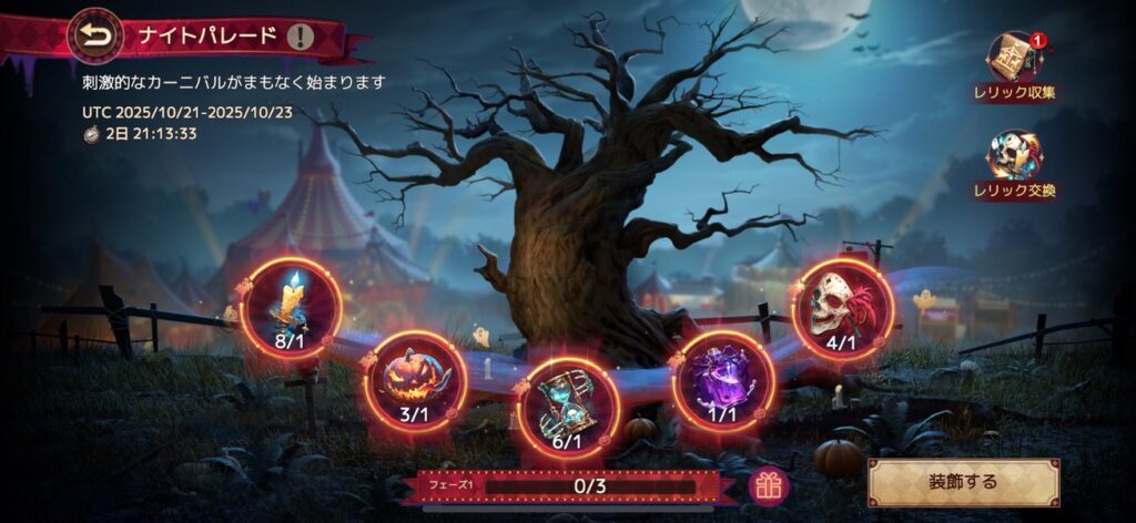 5つのレリックを使用して装飾することで「ハロウィン枯木」を活性化することができます。