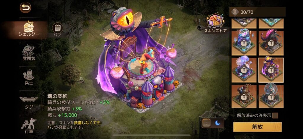 このシェルターは『騎兵の被ダメージ減少+2%』、『騎兵攻撃力+3%』のバフが付いているので、騎兵特化の方にはとてもおすすめできるシェルターなのではないかと思います。